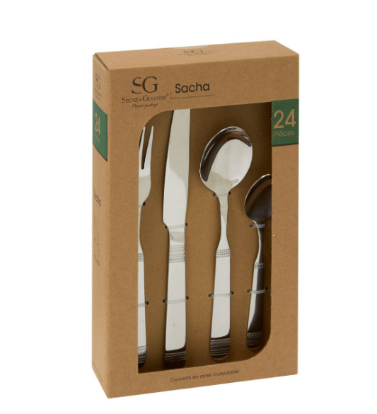 Сетът съдържа 6 ножа, 6 вилици, 6 супени лъжици и 6 чаени лъжички, което го прави практичен избор както за ежедневна употреба, така и за специални поводи.