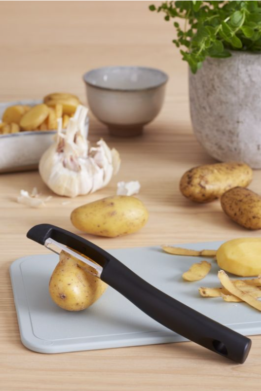 Ергономичната дръжка е проектирана за удобен и стабилен захват, което позволява работа без умора дори при по-големи количества зеленчуци. Леката конструкция прави белачката лесна за маневриране, а компактният дизайн – удобна за съхранение.