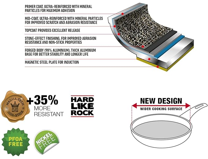 Тиганът Flonal Dura Induction Ø 28 см е част от серията Dura Induction — висококачествени съдове, произведени в Италия с внимание към устойчивост и функционалност. Корпусът е от пресован и кован алуминий с висока дебелина, който осигурява равномерно разпределение на топлината и стабилност по време на готвене, намалявайки „горещи точки“. Покритието Magma‑Tech Plus предлага силно незалепване, устойчивост на надраскване и лесно почистване — възможно е използване дори с метални кухненски прибори. Дъното е специално проектирано с магнитен лист, което прави тигана съвместим с всички типове плотове, включително индукция. Ергономичната дръжка осигурява удобен захват и контрол. С този тиган можеш да приготвяш здравословни ястия с по‑малко мазнина, като се радваш на отлични резултати всеки ден.
