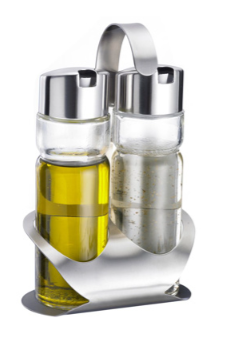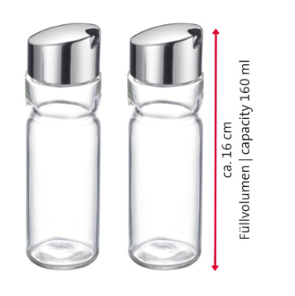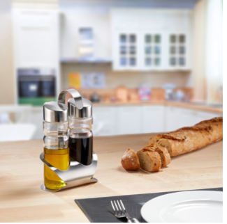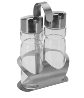 Комплектът „Wien“ от 2 части включва две бутилки‑дозатори с вместимост 160 мл всяка, предназначени за олио и оцет, поставени върху стилна стойка с дръжка за лесно пренасяне. Бутилките са изработени от киселинo‑устойчиво стъкло, а капаците и стойката – от неръждаема стомана, което гарантира издръжливост и устойчивост на корозия. Малките отворчета в капачките позволяват прецизно дозиране на олио или оцет без разливи. Дизайнът е минималистичен и подходящ за класическа или съвременна маса – както у дома, така и в заведение. Могат лесно да се почистват и са подходящи за съдомиялна. Размерите на стойката са приблизително 121 × 73 × 187 мм.