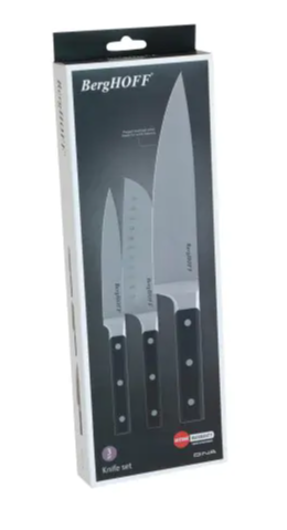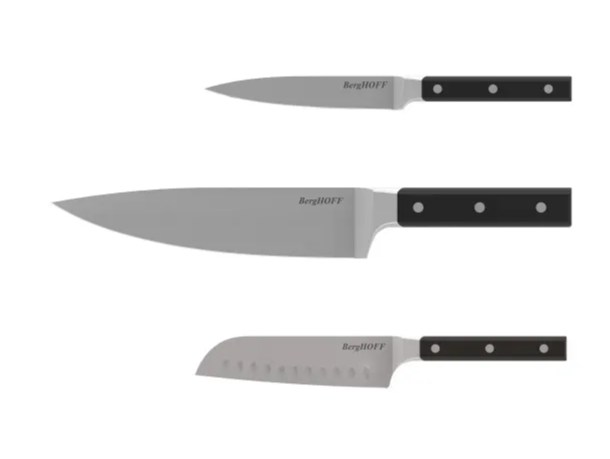 Комплектът „Gene“ от BergHOFF съдържа три ножа от серията Gene, подходящи както за ежедневна употреба, така и за по‑сериозни кулинарни задачи. Включва: готварски нож (Chef’s knife) с дължина около 20 см, японски стил сантоку нож и универсален нож (Utility knife) с по‑компактна дължина. Всеки нож е изработен със силно нито сковано неръждаемо острие, което осигурява отличен баланс и дълготрайна острота. Дръжките са с тройно нитоване, гарантиращи здрав захват и сигурна работа. Този комплект е чудесен избор за потребители, които търсят надеждни основни ножове с добро съотношение между качество и цена — идеален при обзавеждане на кухня или като подарък.