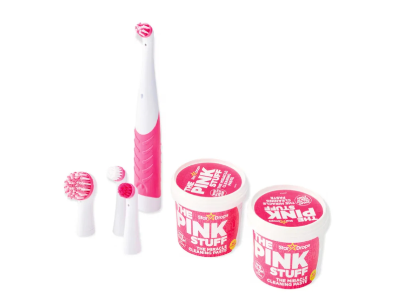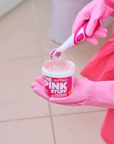 Pink Stuff Miracle Cleaning Paste (2 x 500 g) Pink Stuff Paste е мека абразивна почистваща паста и трябва да се използва внимателно. Нанесете с помощта на мека кърпа или гъба. Втрийте внимателно, преди да изплакнете с гореща вода. Внимавайте да не прилагате прекалено силен натиск, тъй като това може да доведе до надраскване на повърхностите. Бъдете особено внимателни със стъкло, силно полирани стоманени повърхности и керамични котлони. Ако се съмнявате, винаги първо тествайте върху незабележима зона. Не използвайте върху горещи или топли повърхности. Инструментът Miracle The Scrubber Tool с 4 глави на четки и 4 AA батерии Нашият инструмент Miracle Scrubber Tool се доставя с 4 взаимозаменяеми глави на четки, за да улесни тежките задачи за почистване. При първа употреба, моля, прочетете приложените инструкции. Просто поставете предоставените 4 x AA батерии, изберете главата на четката за използване и натиснете и задръжте бутона за кратък взрив или натиснете бутона напред за продължаване на търкането.